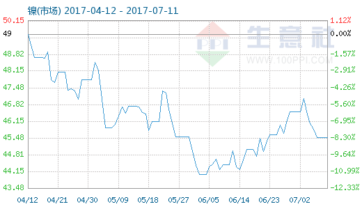 7月11日鎳(市場)商品指數(shù)為45.45,較昨日下降了0.05點(diǎn),較周期內(nèi)最高點(diǎn)100.00點(diǎn)(2011-09-01)下降了54.55%,較2015年11月24日最低點(diǎn)39.05點(diǎn)上漲了16.39%。(注:周期指2011-09-01至今)