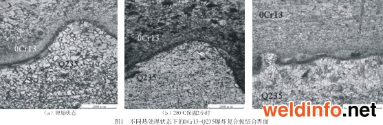 在壓力容器行業(yè)中,特別是一些用于化學(xué)工業(yè)的設(shè)備,由于長期在具有腐蝕性的環(huán)境中服役,因此對其制造材料的耐腐蝕性能有很高的要求。如果用單一的耐腐蝕材料進(jìn)行制造,雖然滿足了使用要求,但是大大提高了生產(chǎn)成本??梢钥紤]在保證材料強(qiáng)度和使用性能的前提下,通過在價(jià)格相對便宜的基板上復(fù)合一層耐腐蝕板材來達(dá)到降低成本的目的[1]。 本文以0Cr13不銹鋼-Q235碳鋼爆炸不銹鋼復(fù)合板為試驗(yàn)對象,研究了不同熱處理時(shí)長對其結(jié)合界面在組織形態(tài)、元素?cái)U(kuò)散及顯微硬度等方面的影響,為確定合適的熱處理時(shí)間提供了理論指導(dǎo)。