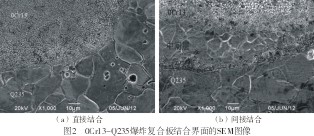 利用掃描電子顯微鏡對爆炸不銹鋼復(fù)合板的結(jié)合界面進(jìn)行了觀察,發(fā)現(xiàn)不銹鋼與碳鋼之間存在兩種結(jié)合方式,一種是直接結(jié)合(如圖2a所示), 另一種是間接結(jié)合(如圖2b所示)。間接結(jié)合方式中的中間層是由于基板和復(fù)板中的合金元素互溶形成的,該區(qū)域的化學(xué)成分介于復(fù)板和基板之間[5]。因?yàn)榻?jīng)歷了金屬熔化和凝固階段,熔合層易出現(xiàn)氣孔、裂紋等缺陷,成為界面結(jié)合較薄弱的區(qū)域。從圖2中還可以發(fā)現(xiàn),不管是以何種方式結(jié)合,界面附近都有超細(xì)晶粒帶出現(xiàn)。這是在爆炸過程中由于材料的高速碰撞,在極短的時(shí)間內(nèi)產(chǎn)生巨大的壓力使該處金屬受到很大的剪切作用,塑性剪切功轉(zhuǎn)變的巨大熱量使金屬在很窄的區(qū)域內(nèi)發(fā)生熔化,之后又急劇冷卻,故形成極細(xì)的組織,甚至有非晶組織形成[6]。