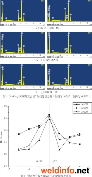 通過掃描電鏡自帶的X射線能譜儀對2#、3# 試樣的基層金屬,結(jié)合界面以及復(fù)層金屬三個(gè)區(qū)域進(jìn)行了分析,結(jié)果如圖3所示,每個(gè)區(qū)域各主要元素的含量列于表3、表4之中。由試驗(yàn)數(shù)據(jù)可得,隨著熱處理時(shí)間的增加,界面兩側(cè)元素的相互擴(kuò)散進(jìn)行得更加充分,Q235中的Cr含量和0Cr13中的Mn、C含量顯著上升[7]。在不銹鋼一側(cè),長時(shí)間的熱處理有助于碳化物的分解,使Cr元素重新固溶到母材之中,消除了貧鉻現(xiàn)象對材料耐腐蝕性能的影響。同時(shí),結(jié)合界面處由于熱處理時(shí)間的增加導(dǎo)致碳化鉻數(shù)量的增加, 脆硬的碳化鉻提高了界面處的強(qiáng)度、硬度,但對其塑性、韌性有不利的影響。